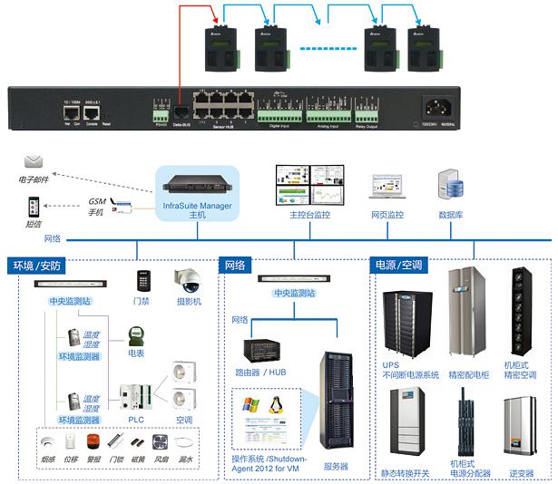 • 中央監(jiān)測站及環(huán)境監(jiān)測器系列可以將偵測到的環(huán)境參數(shù)(溫度、濕度、漏水、煙霧、門窗…)回傳InfraSuite Manager。經(jīng)由InfraSuite Manager判斷后下達(dá)互動指令。
